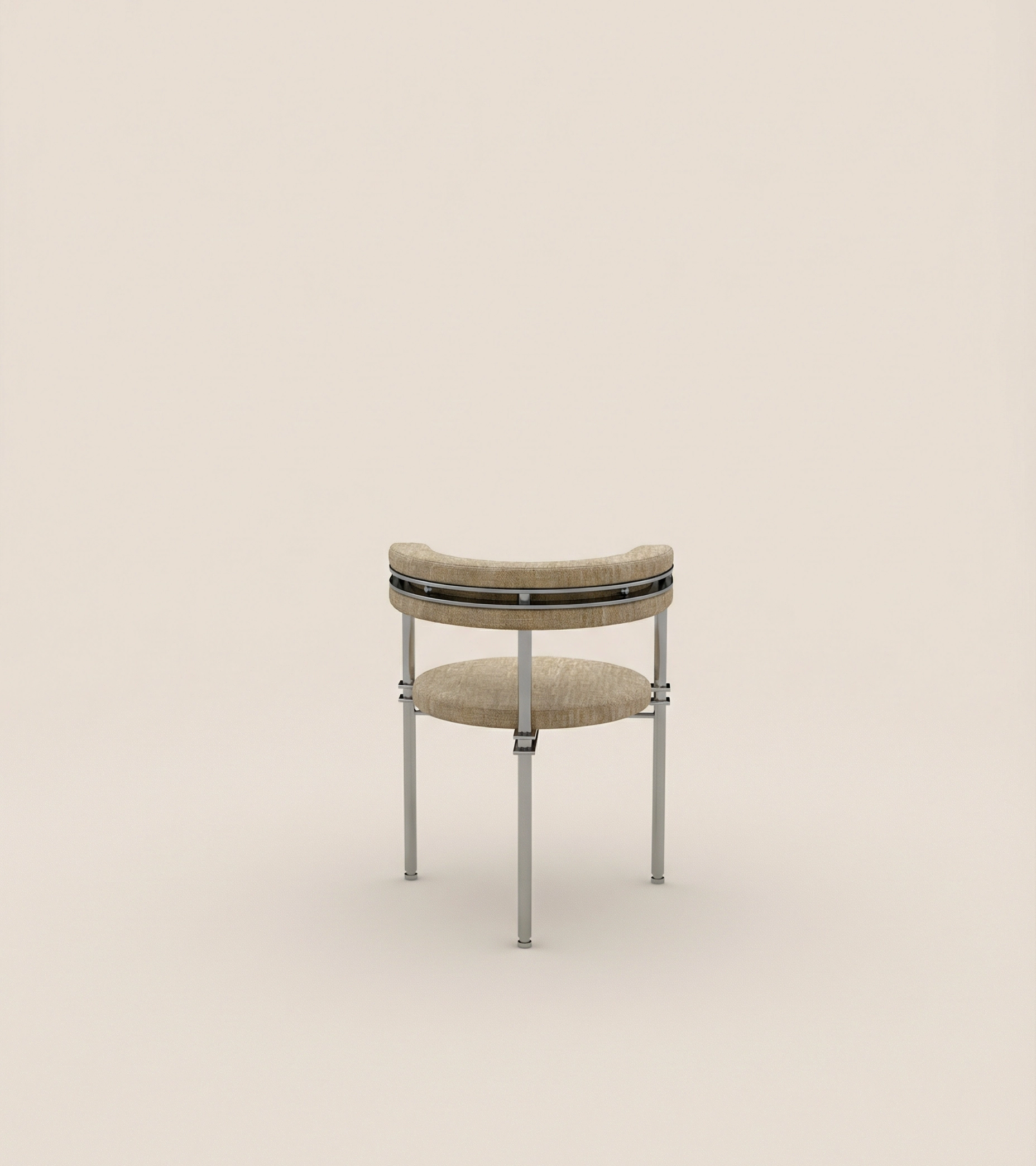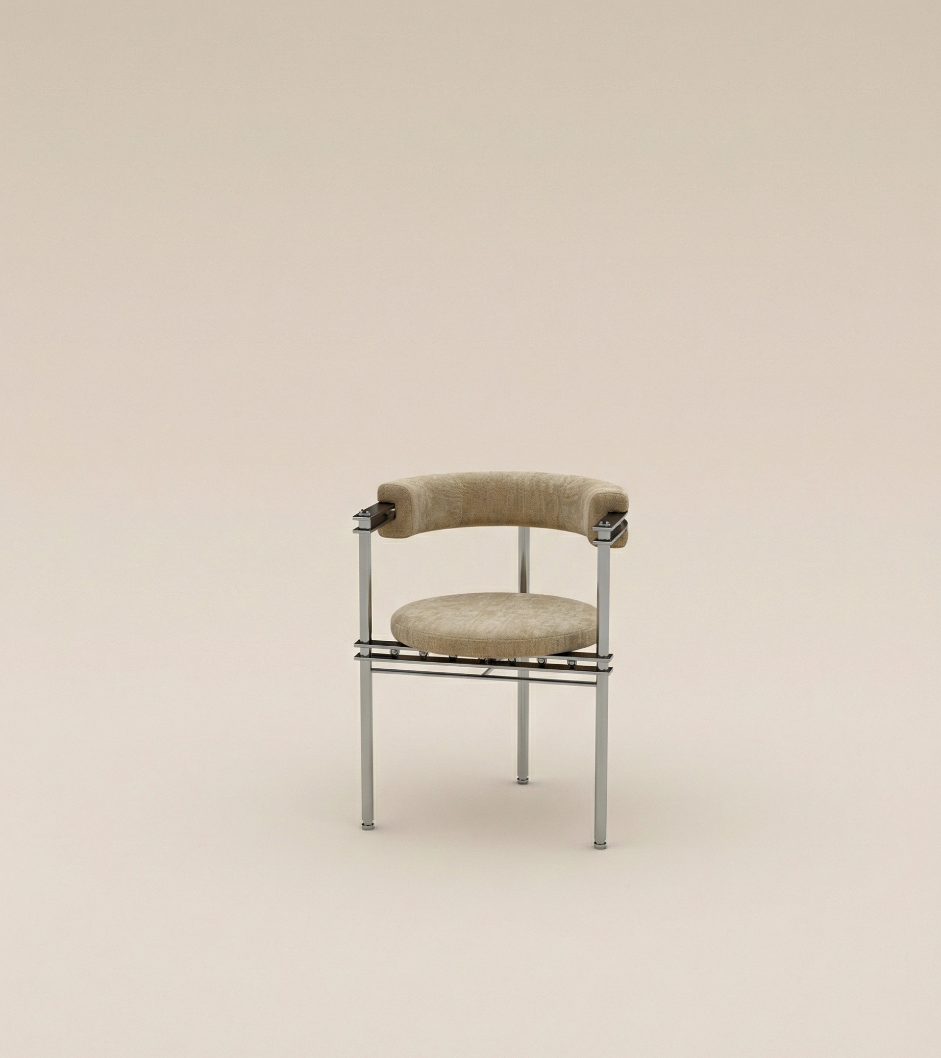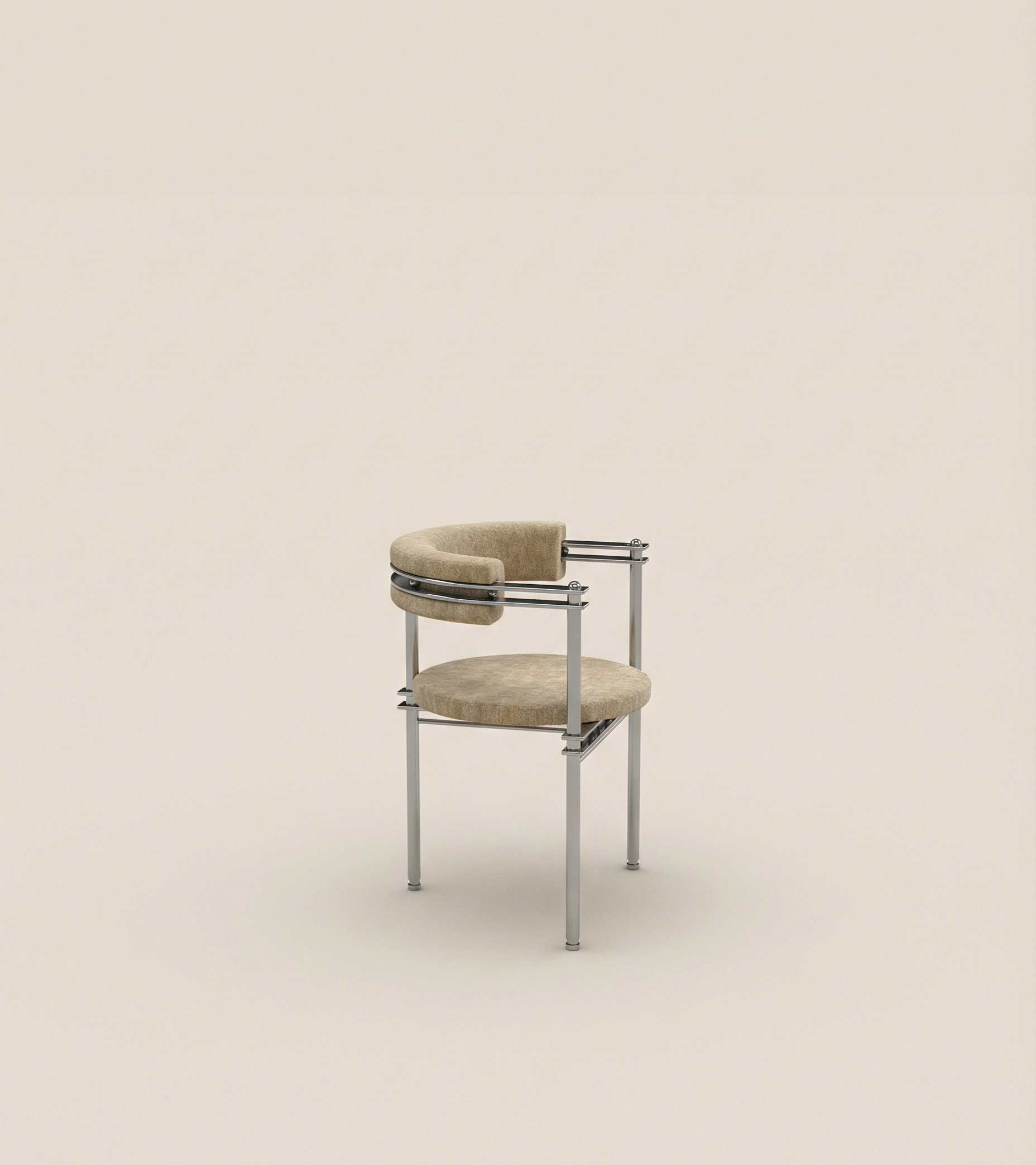 Le fragment n°1 de la collection Edda est une chaise en inox et tissus velours. Fabriquée dans des ateliers de ferronnerie et de tapisserie français.