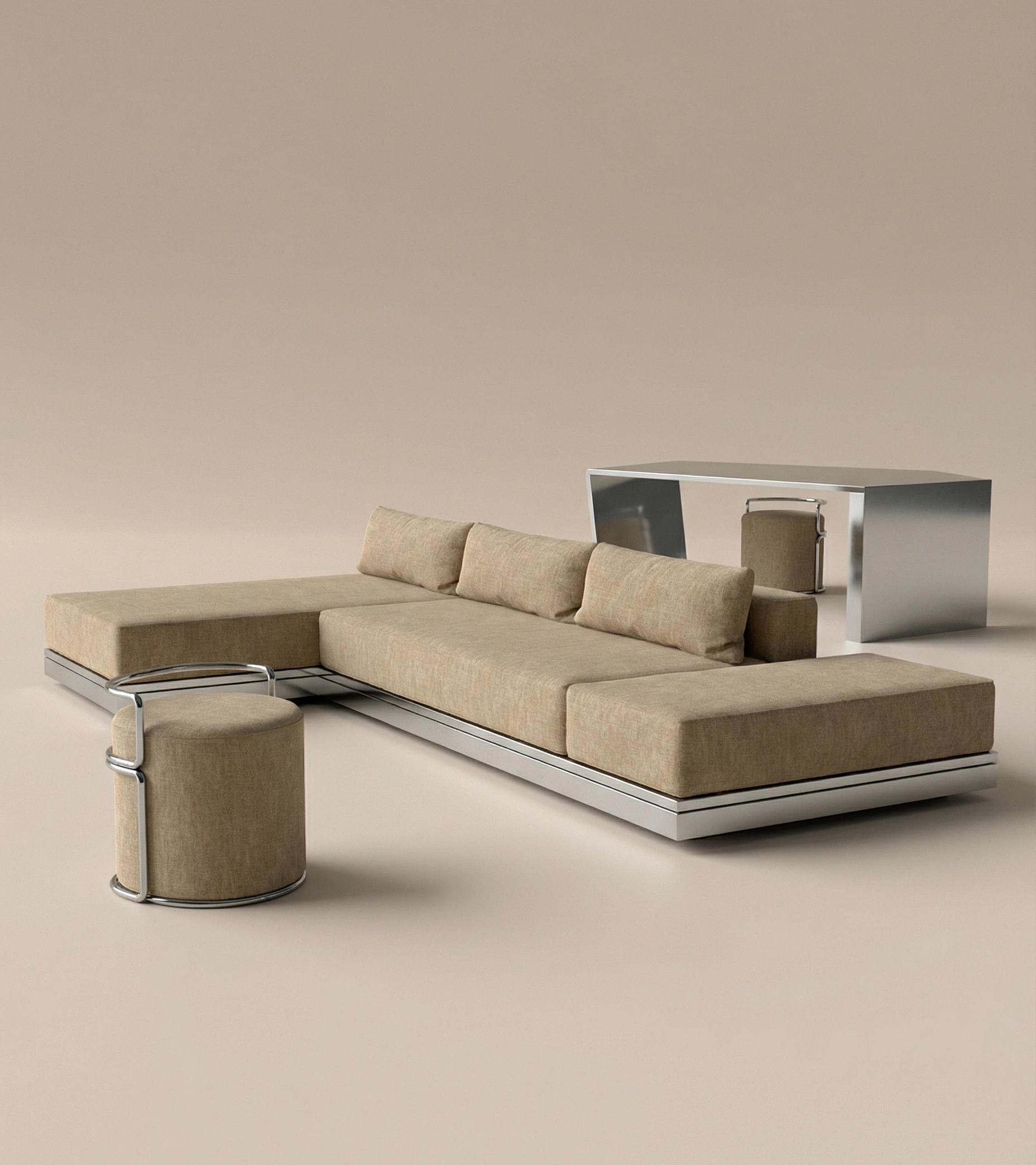 Fragment n°3 HéphaÏ est un canapé en inox brossé et tissus velours. Fabriqué dans des ateliers de ferronnerie et de tapisserie français.